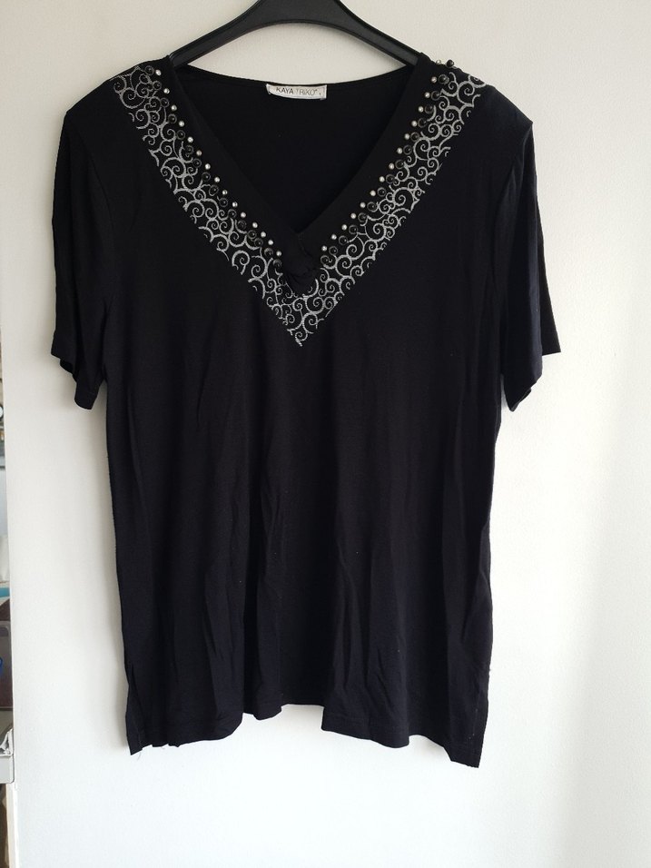 Siyah vatkalı V yaka kadın bluz. Boncuk ve taş işlemelidir. iki kol arası 56cm, uzunluk 68cmdir. söküğü defosu yoktur. kumaş %95 viskon, %5 elastan.