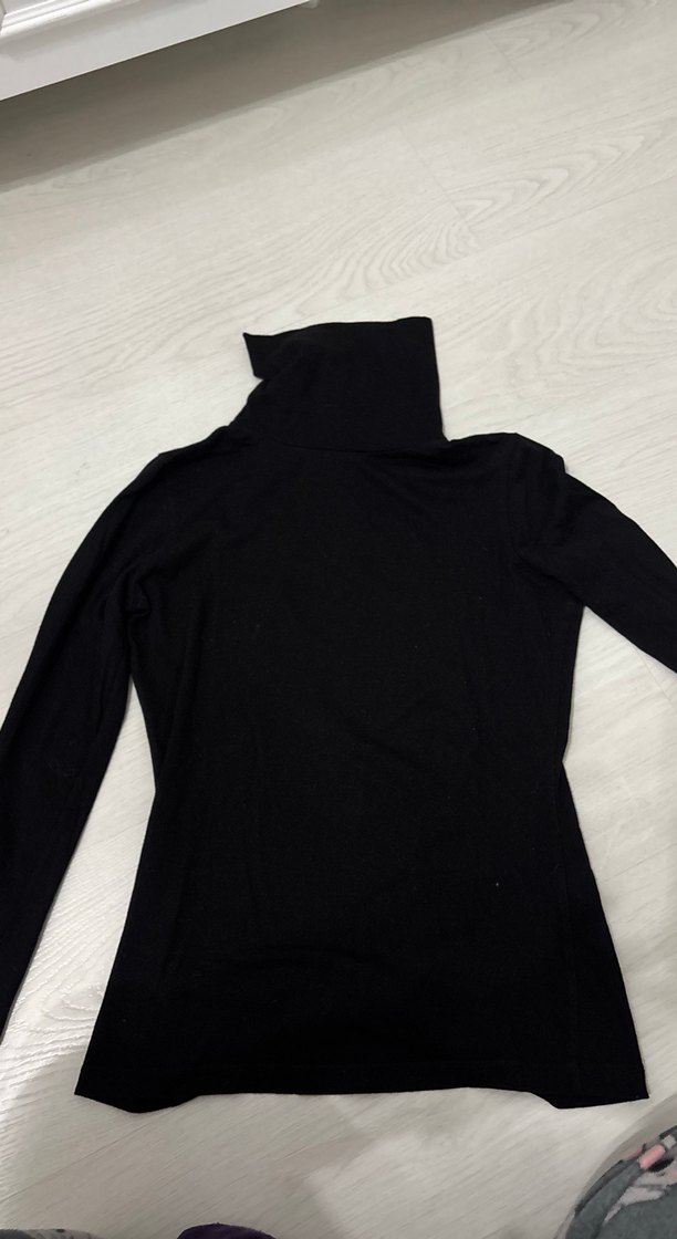 Siyah renkli, boğazlı ve uzun kollu, vücuda oturan ince bluz. Orta uzunlukta, yumuşak ve sıcak dokusu günlük sokak stili için uygun.