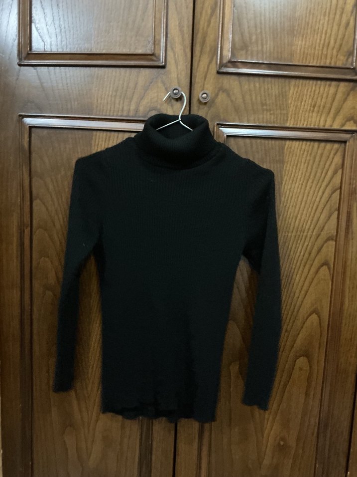Siyah yün triko, boğazlı ve uzun kollu, dar kesim ve normal boyda, minimalist ve normcore tarzıyla günlük kullanıma uygun.