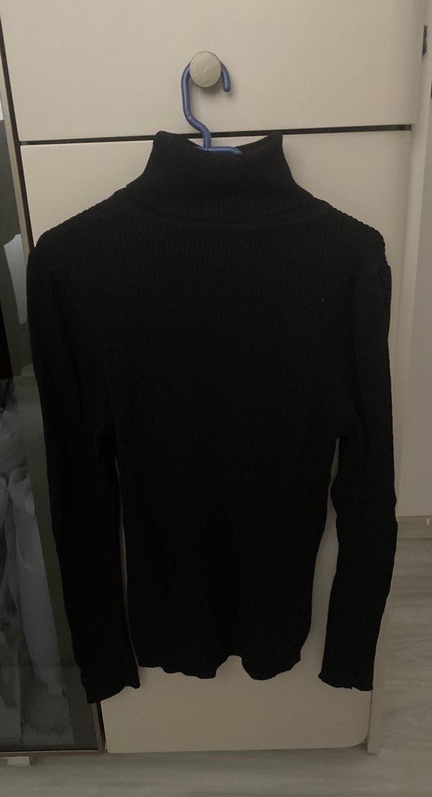 Siyah, boğazlı, uzun kollu ve ince kesim kadın kazağı. Yün örme dokusu ile minimalist goth tarzını yansıtır.