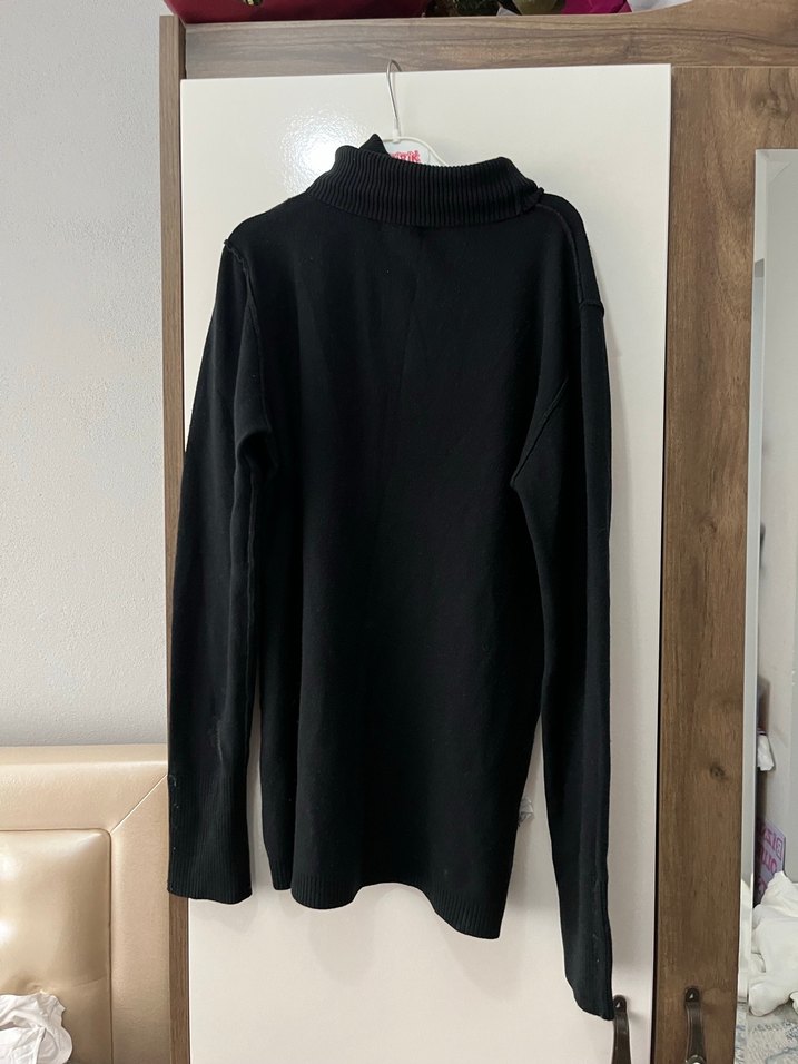 Siyah, boğazlı ve uzun kollu ince triko kazak, midi boyda. Minimalist sokak stiline uygun, günlük kullanıma ideal.