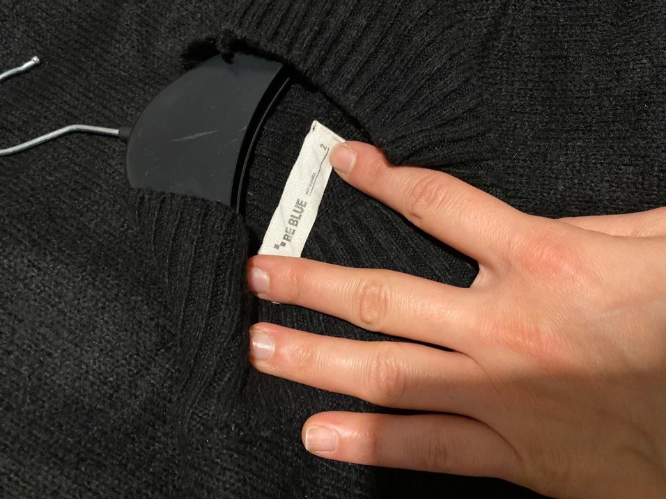 Siyah renkli, örgü yün kumaştan, boğazlı ve uzun kollu, bol kesim normal boyda rahat bir kazak.