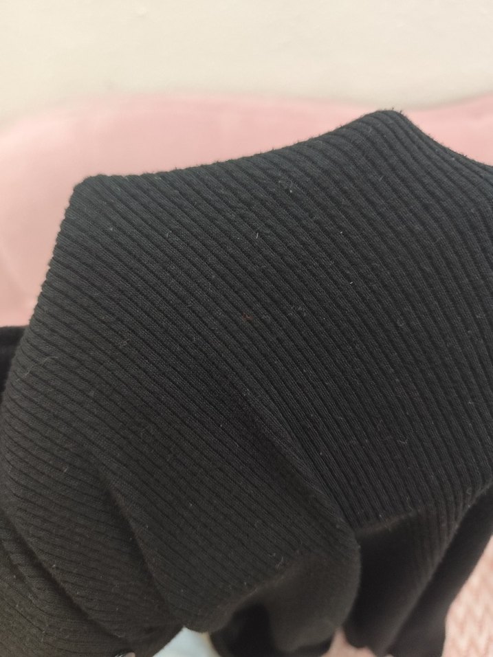 Siyah, boğazlı ve uzun kollu, elastik detaylı, yumuşak sentetik kumaştan yapılmış, rahat ve normcore tarzda kadın triko kazak.