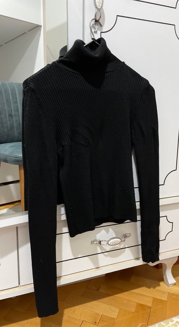 Siyah, boğazlı, uzun kollu, yumuşak yün örme dar kesim kadın kazak. Normal midi boyda, desen içermeyen, rahat sokak stili için uygun.