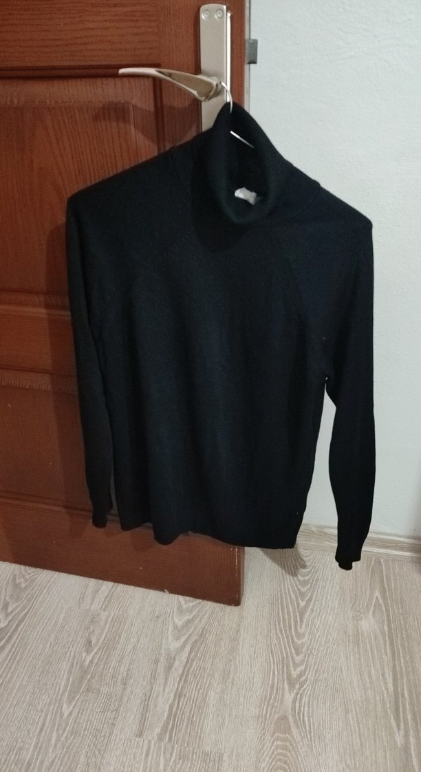Siyah, boğazlı ve uzun kollu, ince kesim yün triko kazak. Minimalist tarzıyla günlük kullanıma uygundur.