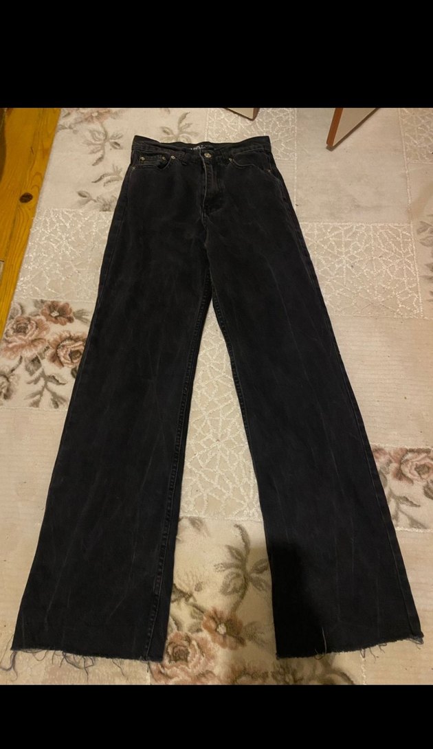 Siyah renkli, bol kesim ve midi boyda olan bu denim pantolon, kürk detaylarıyla sokak stili havası katıyor, günlük kullanıma uygun.