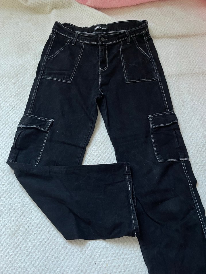 Siyah denimden, bol kesim ve midi boy kadın kot pantolon. Beyaz dikiş detaylı yüksek bel ve çoklu ceplerle sokak stiline uygun, günlük kullanıma elverişli. 2-3 kez giyilmiştir Bedeni 29-30