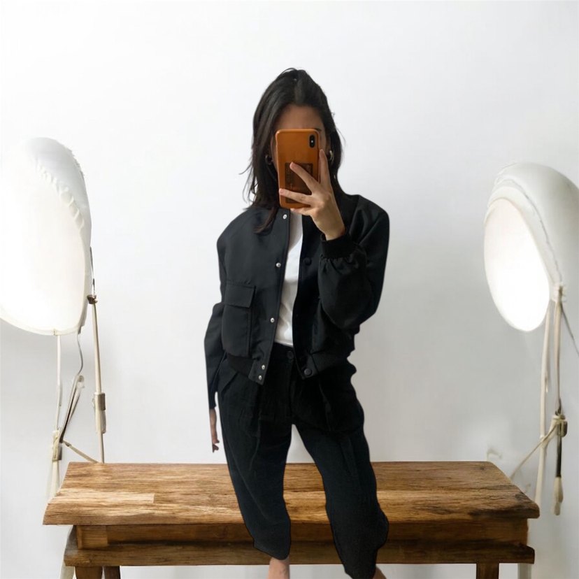 Siyah , notched lapel yakalı ve uzun kollu kadın bomber ceket. Normal boy ve regular fit ile sade, şık bir günlük kullanım parçası.