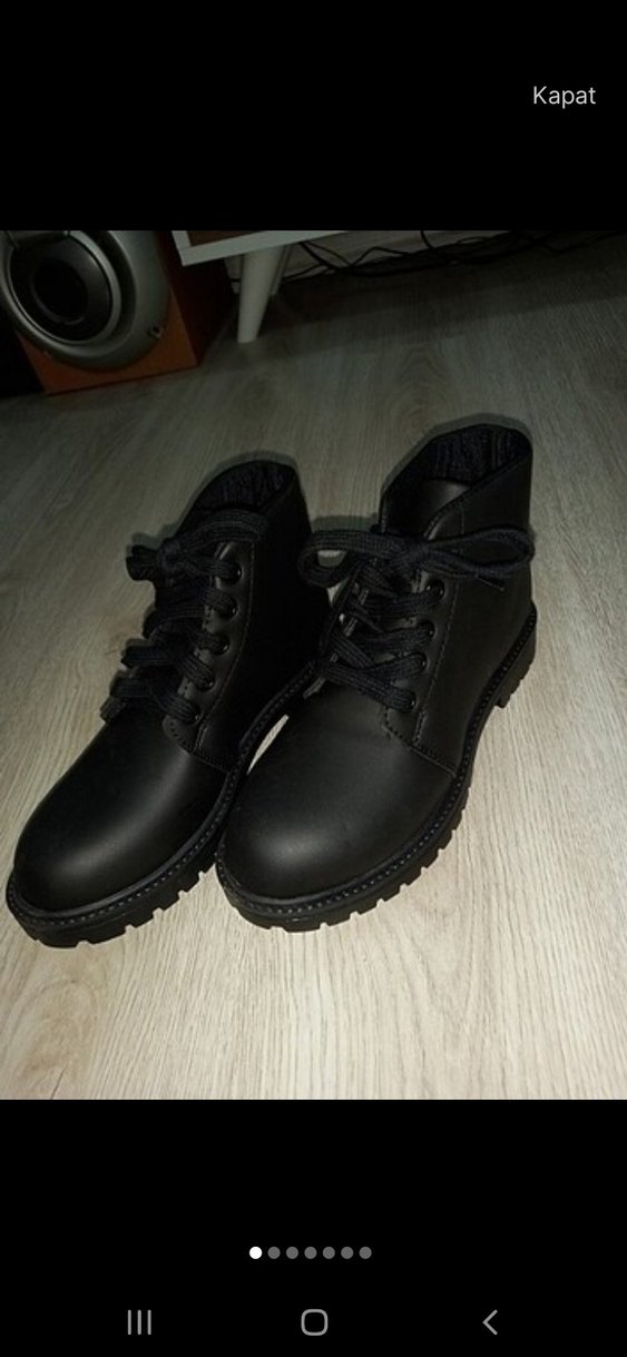 Siyah, bağcıklı kadın botları,ve desen içermeyen minimalist tasarıma sahip. Kauçuk malzemeden üretilmiş, günlük kullanıma uygun, şık ve rahat.36 numara ama 35 uyumlu dar kalıp hiç kullanılmadı sıfır
