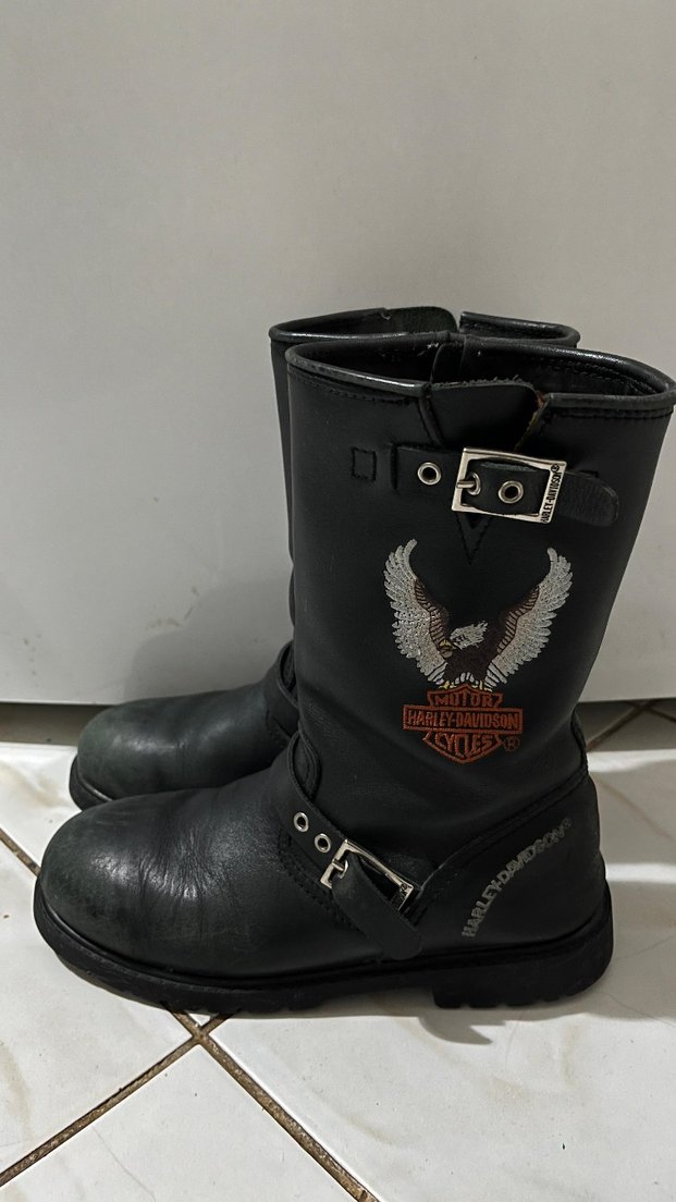 Siyah deri, tokalı biker botlar. Harley Davidson amblemi ve SYLTES yazısı bulunur. Günlük kullanım için uygun, grunge punk tarzında.