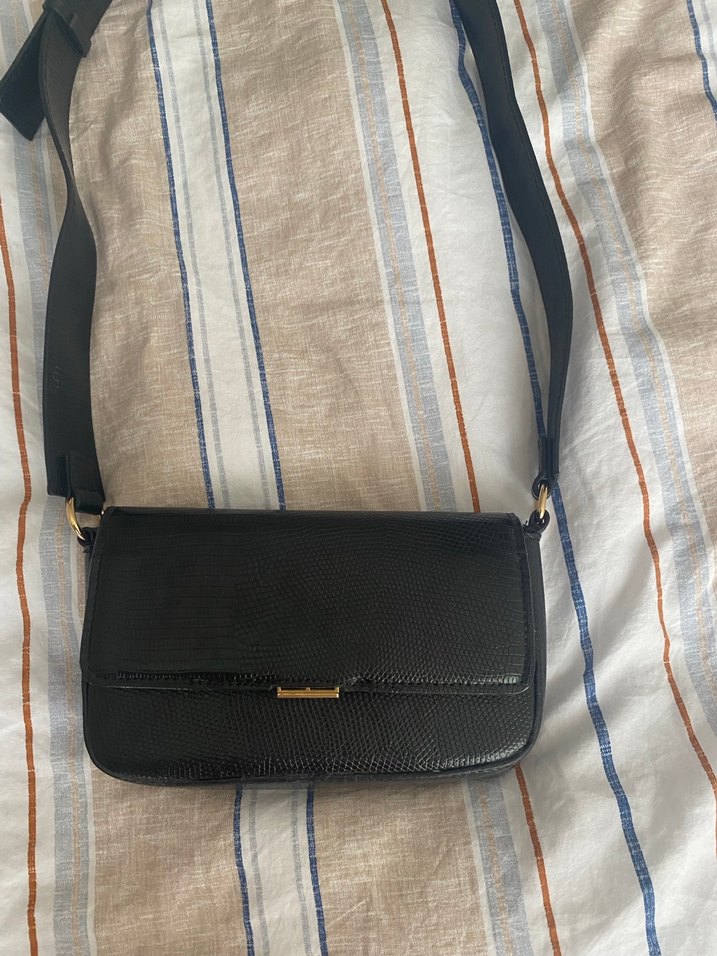 Siyah deri, yılan derisi desenli, tokalı kadın çantası. Günlük kullanıma uygun, klasik Paris tarzında bir sokak giyimi aksesuarı. Hiç bir sorunu yoktur