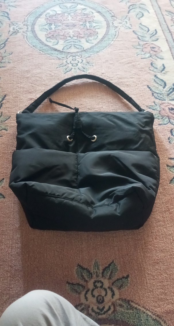 sentetik kumaşı vardır hiç kullanılmadı etiketi yoktur. 1 tane büyük gözü vardır içten dışında ise daraltmak için ipi vardır. gayet temiz sağlam ve kullanışlıdır.
