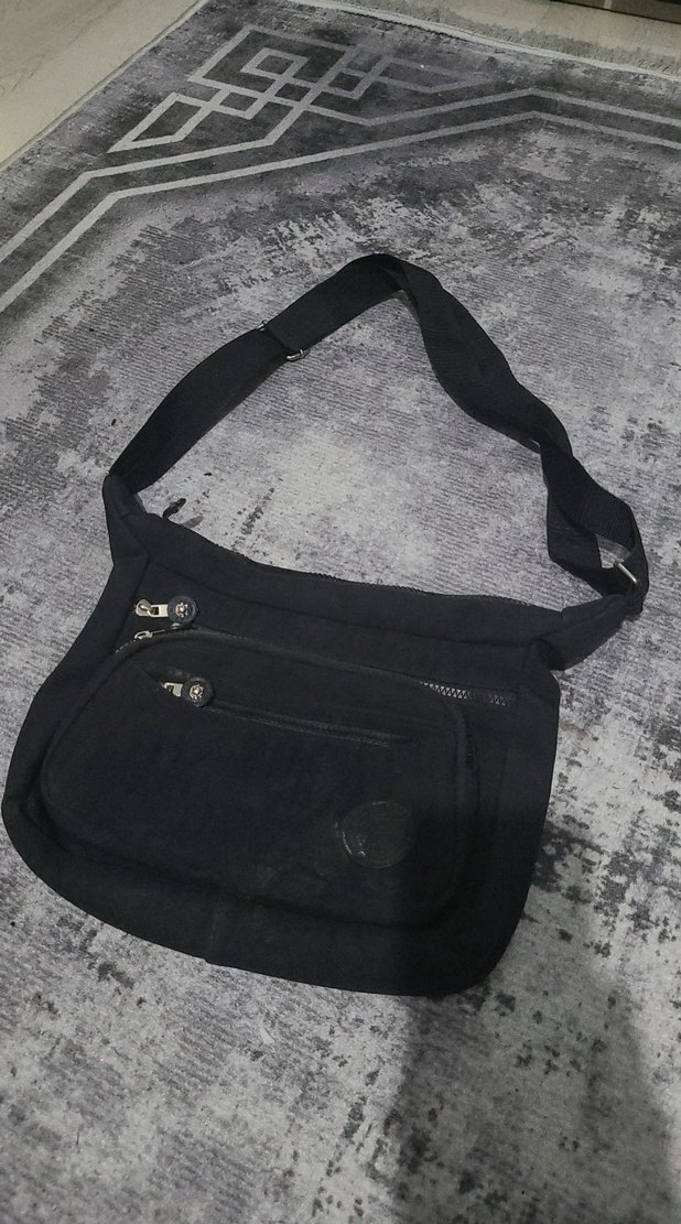Siyah sentetik kumaştan yapılmış, tokalı, çok bölmeli kadın çapraz askılı çanta. Günlük ve sokak stili için uygun. kullanilmadi çok krinkil model