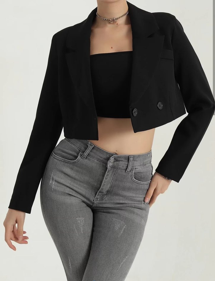 Siyah Kadın Çift Düğmeli Crop Ceket