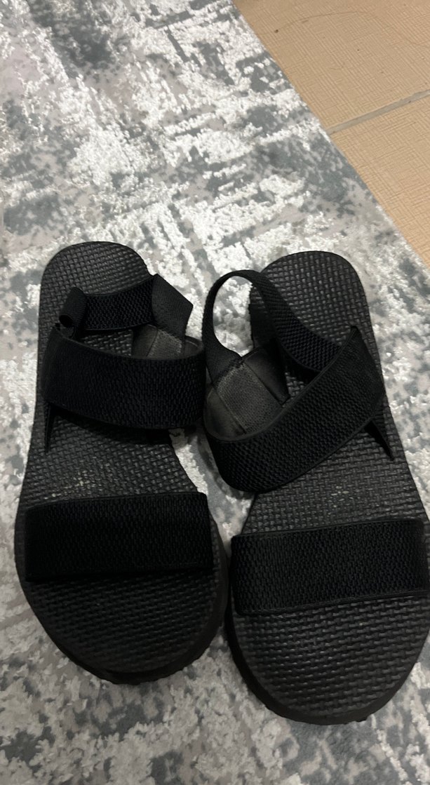 Siyah renkte, cırt cırtlı bantlara ve dolgu topuklara sahip kauçuk kadın sandaletleri. Outdoor athleisure ve sokak stiline uygun, rahat ve sade tasarım.