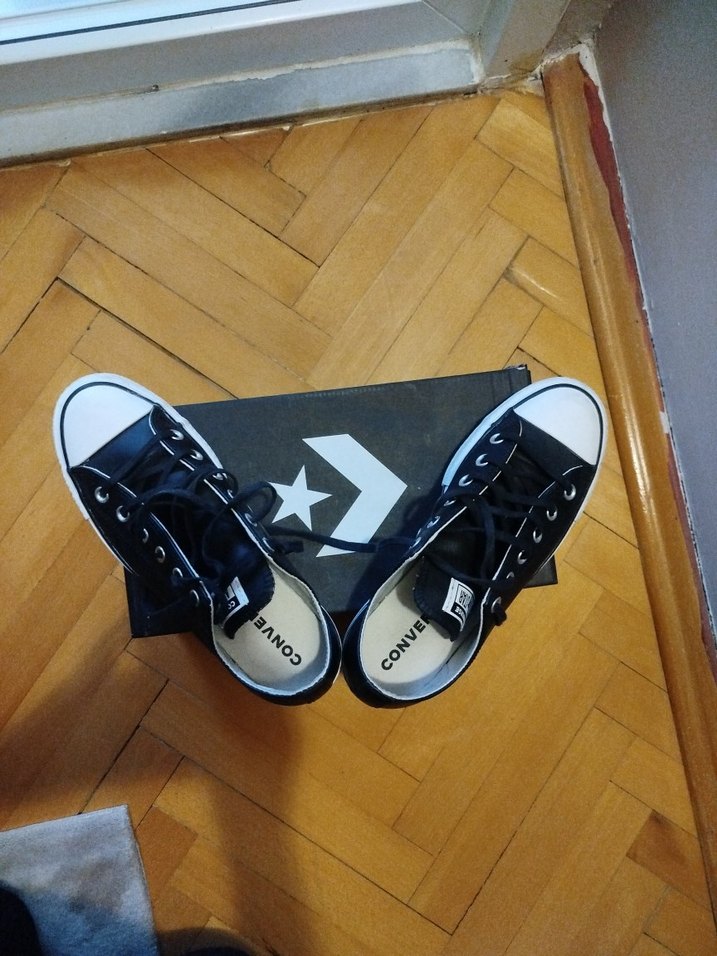 Siyah renkli Converse kadın spor ayakkabı, düz kauçuk tabanlı ve bağcıklı tasarımlı, günlük kullanım ve sokak stili için uygun. tertemiz birkaç kez giyildi