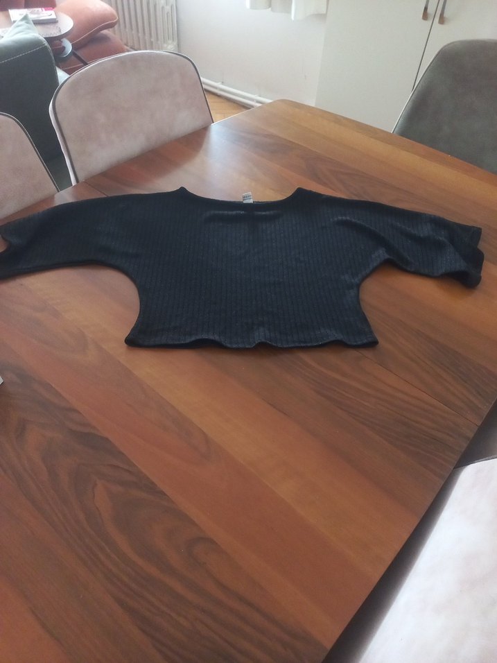 Siyah renkli, kayık yaka crop s beden Yumuşak sentetik kumaştan, midi boyda ve minimalist goth tarzında, günlük kullanıma uygun.