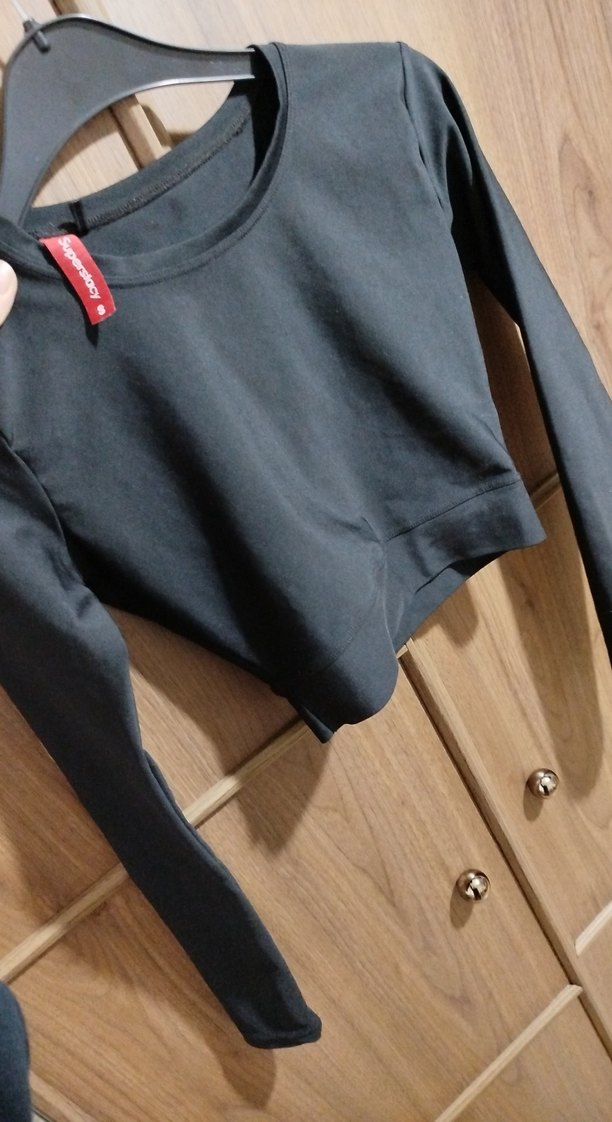 Bu siyah kadın sweatshirt, uzun kollu ve yuvarlak yakalı olup, yumuşak sentetik kumaştan yapılmış kısa ve vücuda oturan bir tasarıma sahiptir. Spor ve gündelik şıklık için uygundur.