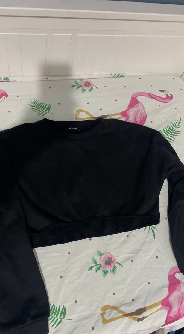 Siyah renkli, yuvarlak yakalı ve uzun kollu, bol kesim kadın crop sweatshirt. İci polarlı rahat