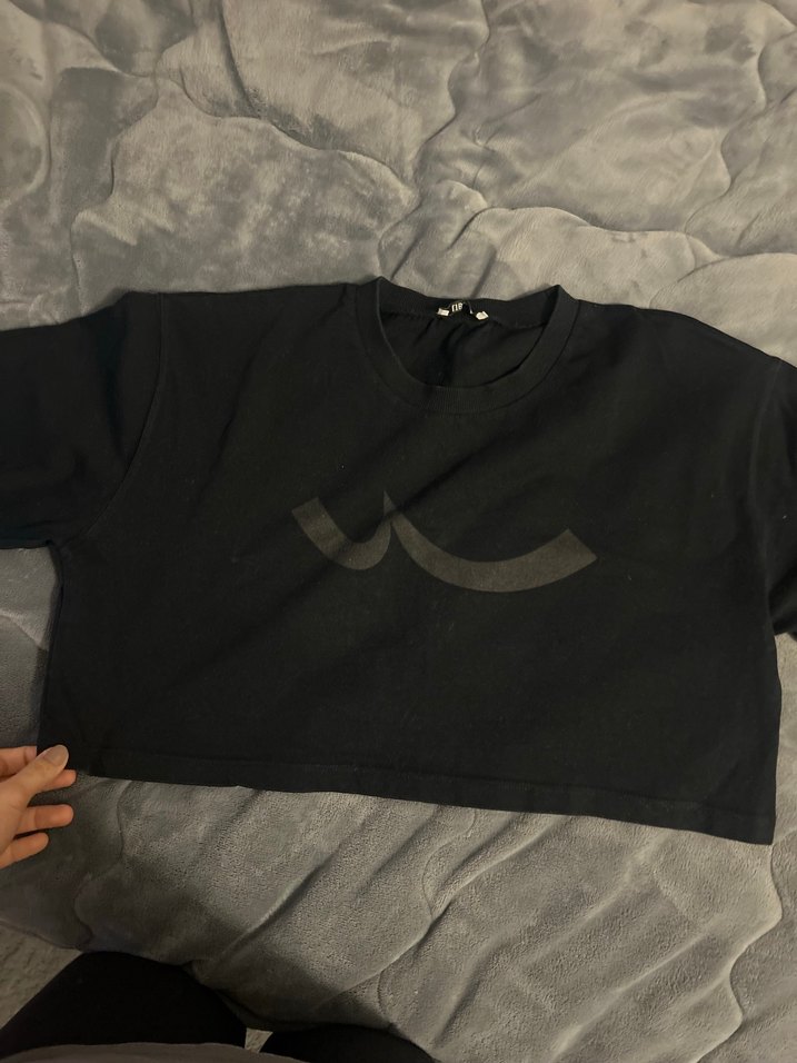Siyah crop tişört, yuvarlak yaka ve kısa kollu. Sentetik kumaştan, rahat ve salaş kesimli, günlük kullanım için uygun.