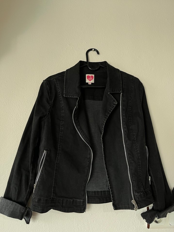Fermuarlı, siyah kadın denim biker ceket, kesik yaka ve normal kesim özelliklerine sahiptir. Günlük kullanıma uygundur.
