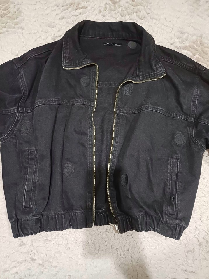 Düğmeli, siyah denim ceket. Notlu yaka, bol kesim ve uzun kolludur. Günlük kullanıma uygun, rahat sokak stili tarzında.