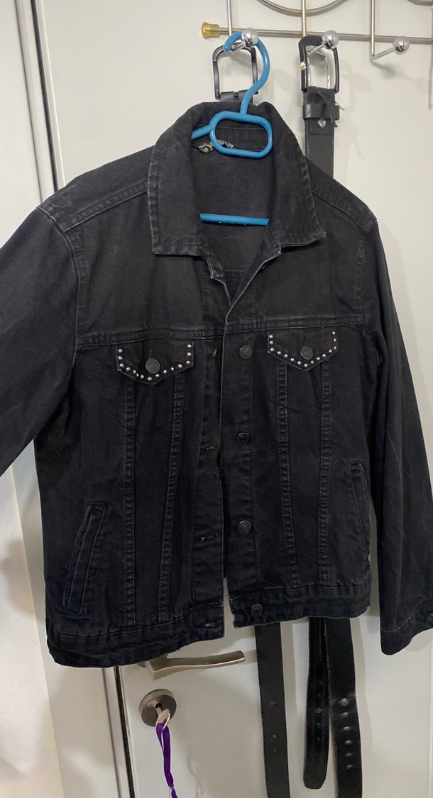 Siyah renk, düğmeli, bol kesim kadın denim ceket. Notch yakalı ve askılı kollu, günlük sokak stili için uygun. ✨