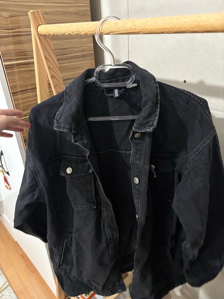 Siyah renkli, düğmeli, bol kesim kadın denim ceket. Uzun kollu,oversize, günlük kullanıma uygun.Pazarlık mevcut.