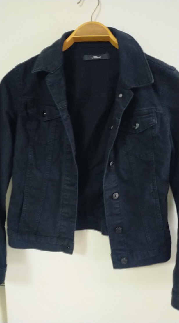 Siyah denim kumaştan, düğmeli ve yakası kesik detaylı kadın ceket. Uzun kollu, normal kesim, gündelik sokak stili için uygundur.