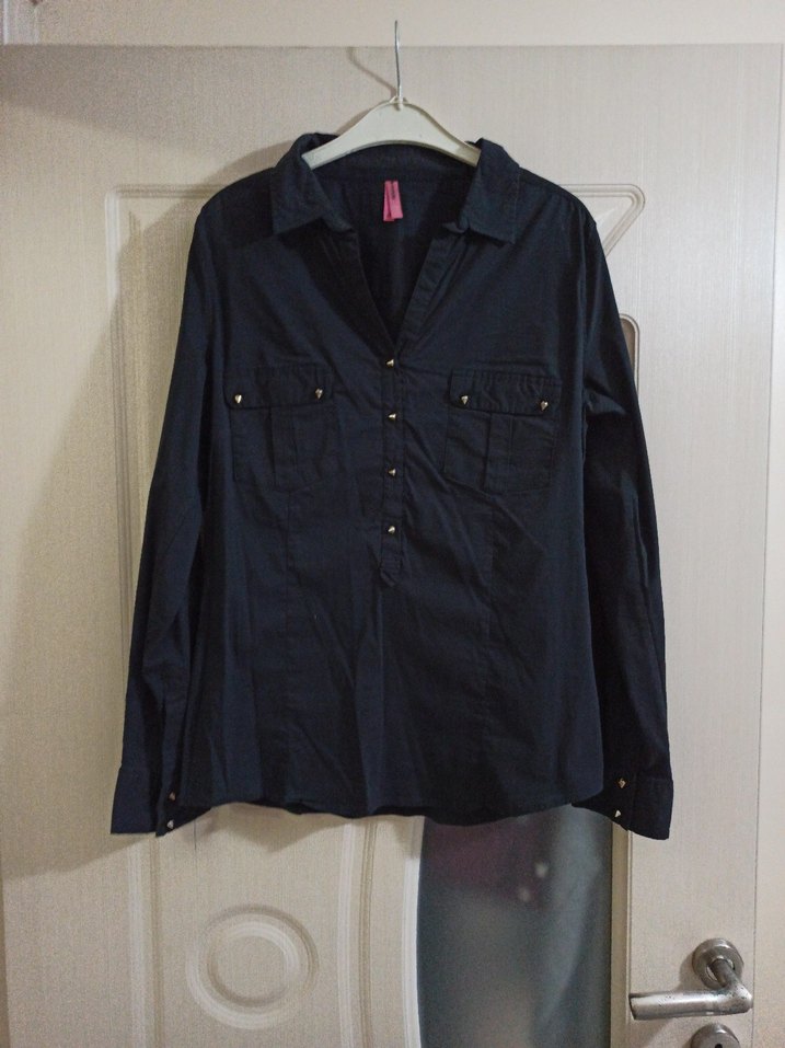 Siyah denim kumaştan, uzun kollu ve yakalı kadın gömlek. Düğmeli ve bol kesimdir, günlük sokak stili için uygundur.