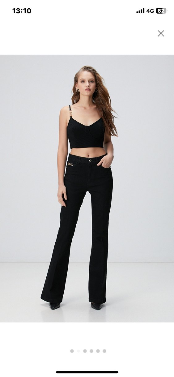 Siyah denimden yapılmış, ispanyol paça ve normal boyda bu pantolonlar, günlük kullanım için rahat ve şık bir sokak stili sunar. Desensiz ve düzenli kesimlidir. 25 beden
