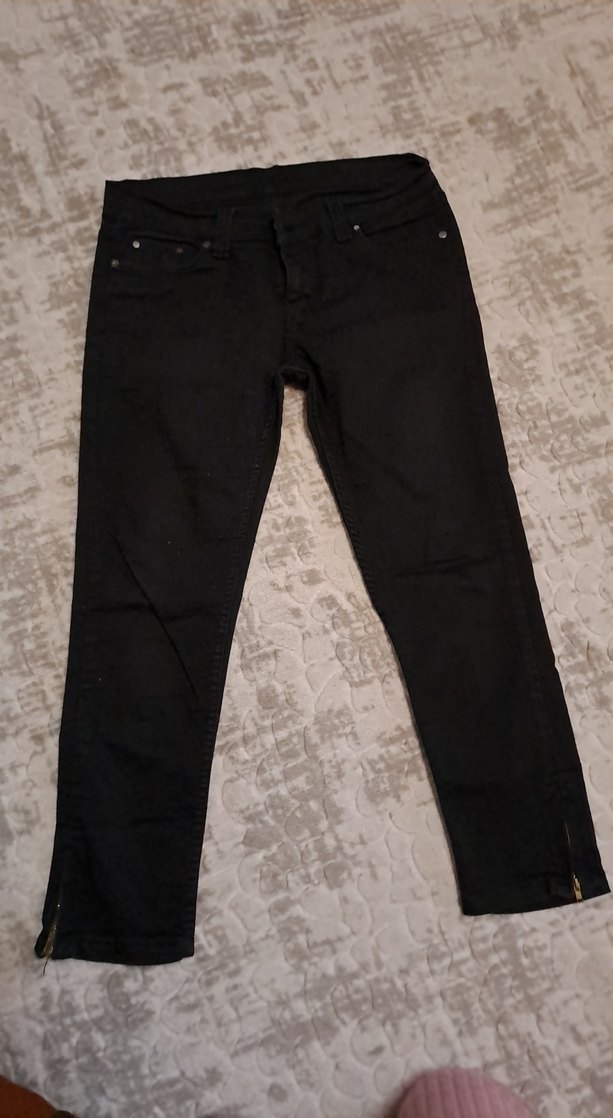 Siyah renkli, regular fit kesime sahip normal boy kadın denim jean. Paçalarda fermuar detayları bulunur, günlük sokak stili için uygundur. bir iki küçük nokta leke var sorunu yok