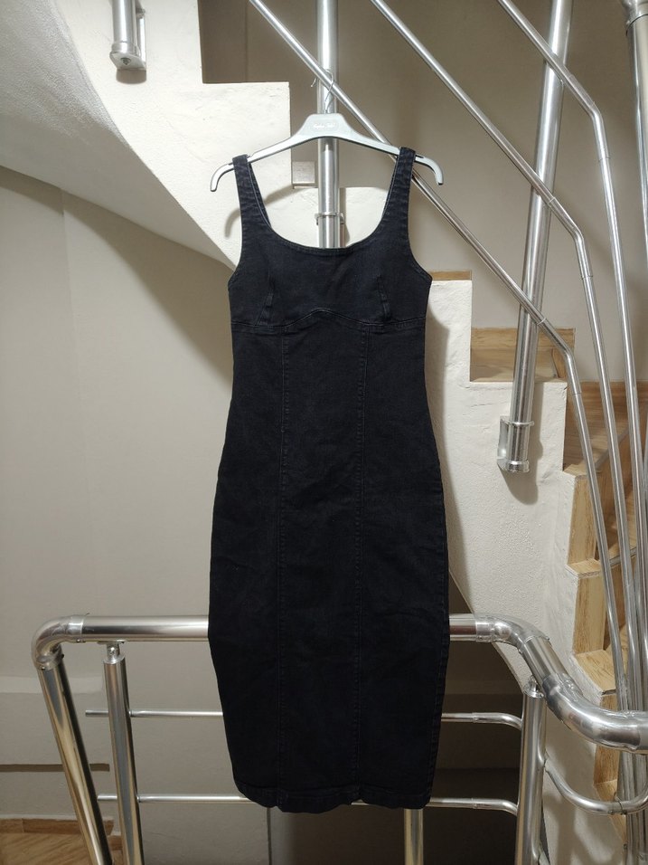 Siyah, kolsuz, midi boy, vücuda oturan denim elbise. Askılı ve desen içermeyen minimalist tasarımıyla günlük kullanıma uygun, şık bir parça.