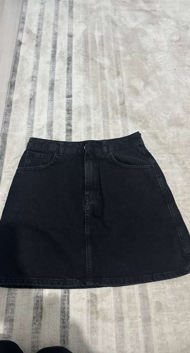 Siyah renkte, rahat kesimli denim mini etek. Günlük kullanıma uygun, desen içermeyen sade ve şık tasarım.