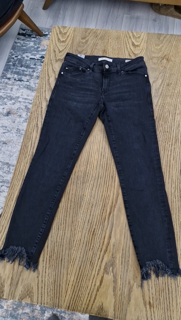 siyah renkte normal boy ve regular fit kesime sahip, paçaları püsküllü kadın denim pantolon.