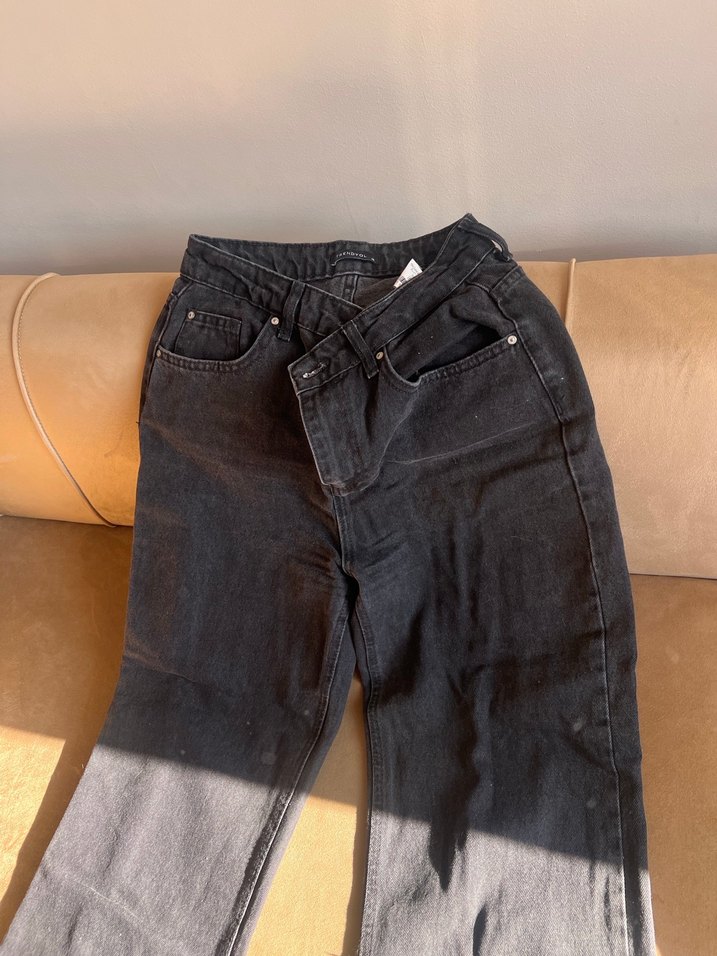 Siyah kadın denim pantolon, normal boy ve regular fit. Tokalı detay içerir, günlük rahat kullanım için uygundur.