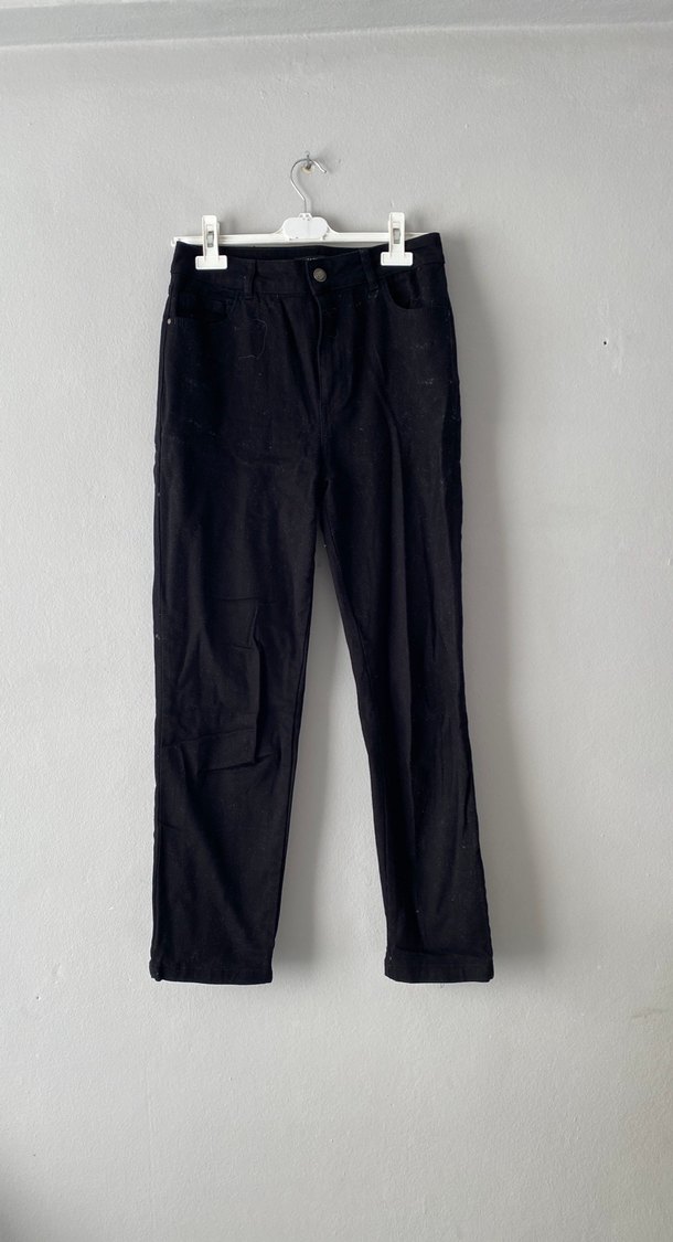 Siyah renkli, regular fit kalıp ve midi boyda kadın denim pantolon. Günlük kullanıma uygun, minimal ve şık tarz sunar.