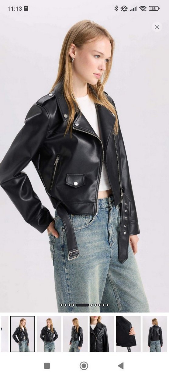 Siyah deri biker ceket, tokalı kayışlar ve kesik yaka ile. Midi boy, normal kesim, günlük kullanıma uygun. İKİ KEZ GİYDİM SADİCE TEMİZ GÖRÜNDÜĞÜ GİBİ 70-80 kg aralığında ki her kese tam olur