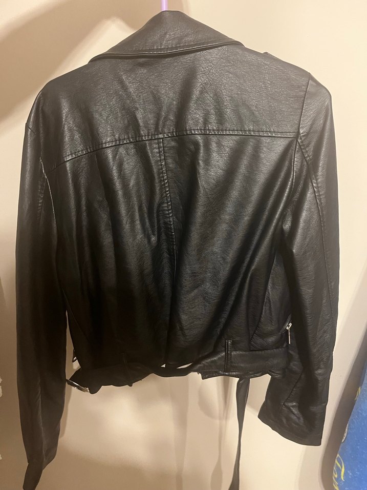 Fitted kesim siyah deri biker ceket, yakası kesik ve tokalı detaylara sahip. Askılı kollu ve normal midi boyda, romantik akşamlar için şık bir tercih.