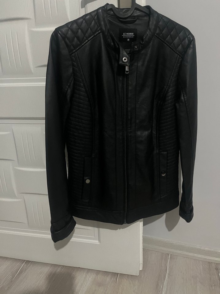 Siyah deri biker ceket, fitted kesim, yakalı ve uzun kollu. Omuzlarda kapitone detaylar ve fermuarlı ön kapanış bulunur. Günlük kullanıma uygun.bir defa kullanıldı kilo aldığım için olmuyor