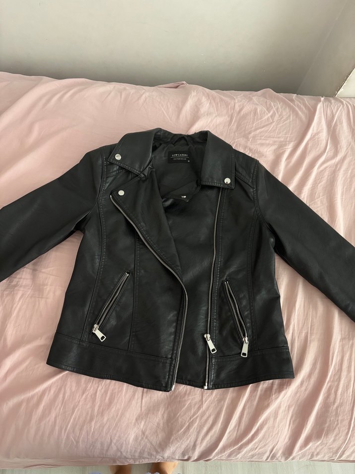 Siyah, deri, ince kesim biker ceket. Çentikli yaka, fermuarlı cepler ve tokalı detaylara sahiptir. Günlük kullanıma uygundur. Ense kısmında ufak dökülme var giymeye engel değildir ürün birkaç kez giyildi