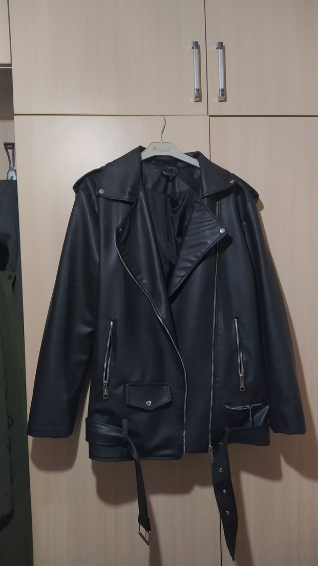 Siyah renkli kadın deri biker ceket, kemerli ve yakası kesik detaylıdır. Strappy kollu, midi boy ve regular fit olarak tasarlanmıştır.