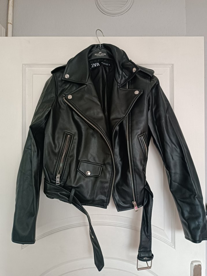 Siyah, dar kesim kadın deri biker ceket, yakasında kesik yaka, tokalı detaylar ve askılı kollara sahip, midi boyda rock punk havası taşıyor.