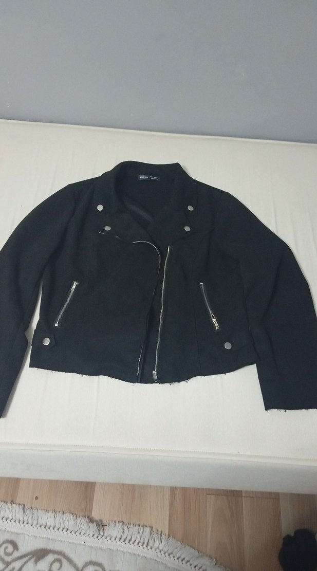 Yumuşak kürk kumaştan yapılmış, fermuarlı cepli, kesimli yakalı ve dar kesim siyah biker ceket.