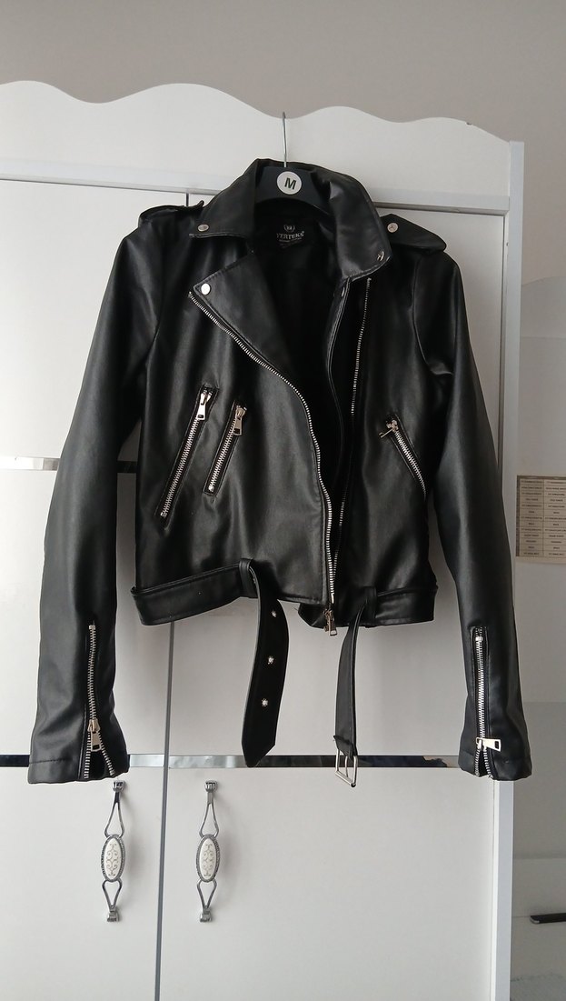 Siyah, oturan kesim deri biker ceket. Notlu yaka, tokalı kayışlar ve fermuarlı kollar içerir. Midi boy, desensiz tasarım.