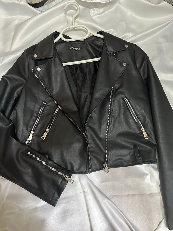 Fermuarlı cepleri ve kesik yaka detayıyla siyah, dar kesim deri biker ceket. Normal boy ve askılı kollu, trend casual tarz için uygun.