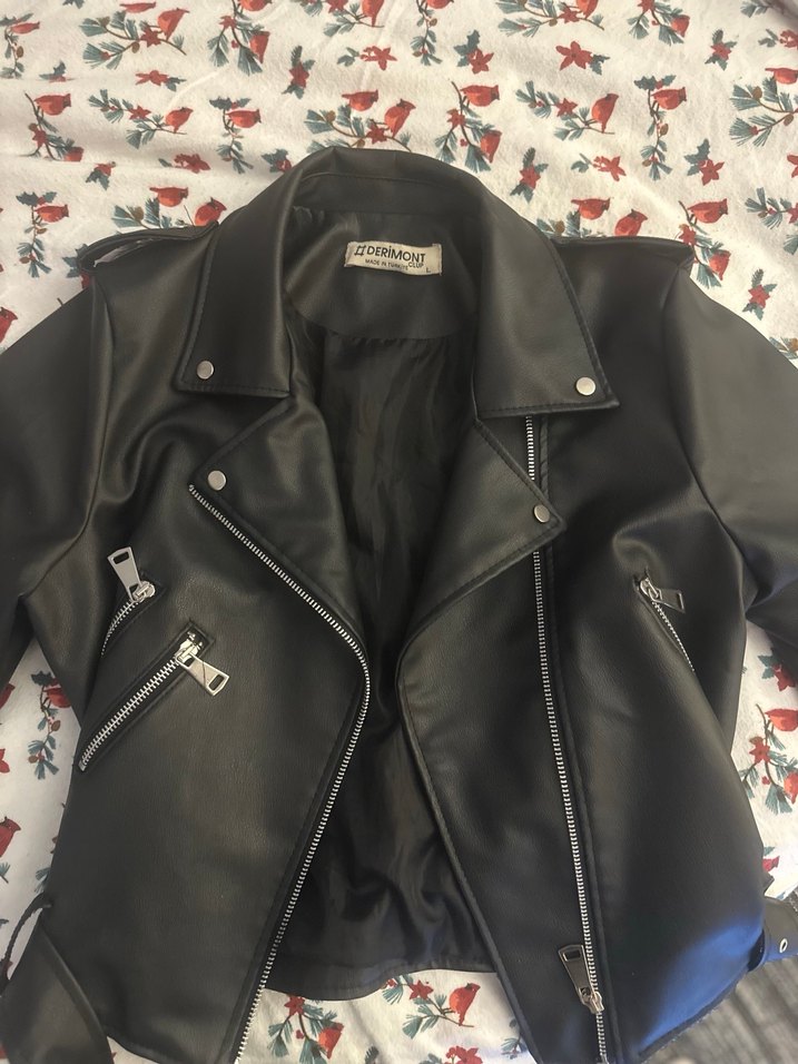 Fitted kesim siyah Derimont biker ceket. Çıtçıtlı yakası ve fermuarlı cepleri vardır. Boyun kısmında çok ufak çatlaklar mevcuttur, onun dışında temizdir.