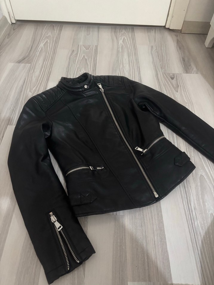 Siyah, dar kesim deri biker ceket uzun kollu ve fermuarlı detaylara sahiptir. Çentikli yaka ve normal midi boydadır, günlük sokak stili için uygundur. Ense kısmında derileri dökülmüş fakat yamayaparak kurtarılır