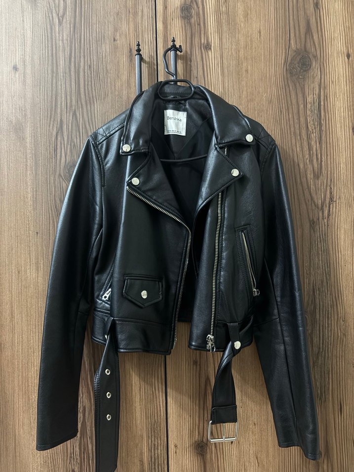 Bu siyah dar kesim deri biker ceket, yakalı ve tokalı detaylara sahiptir. Normal boyda ve askılı kolludur, minimal ve rock punk havası sunar.