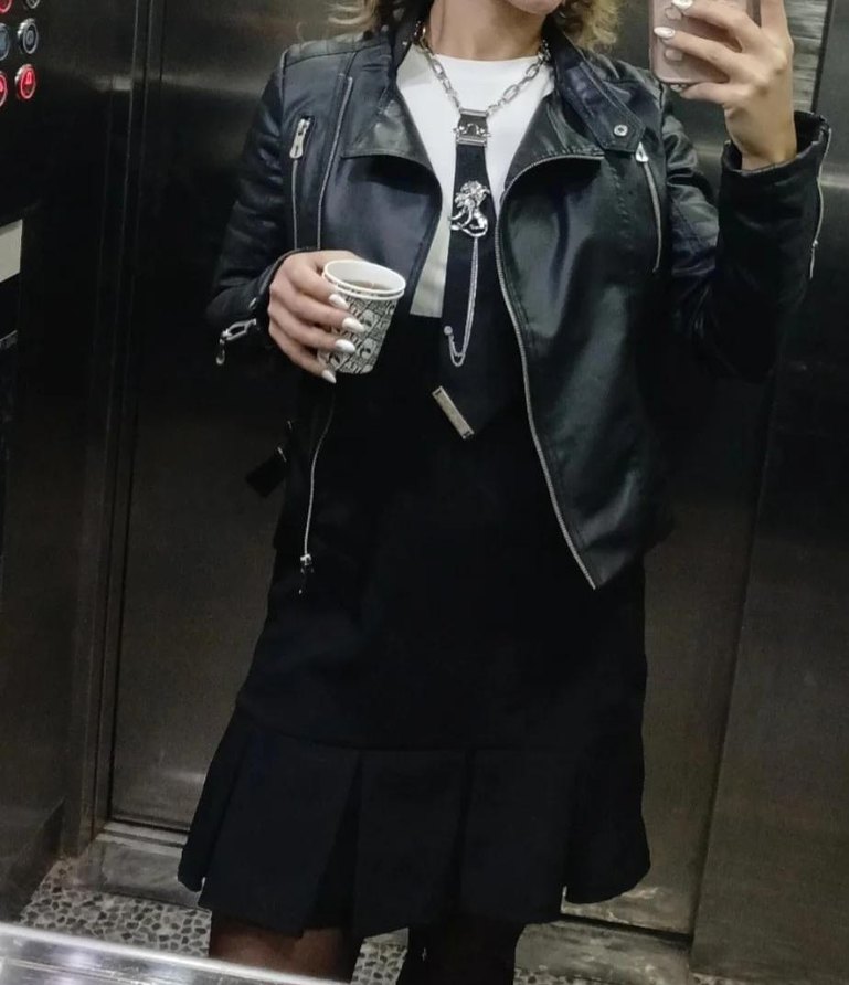 Siyah, deri biker ceket, çıtçıtlı yaka ve tokalı detaylara sahiptir. Fermuarlı cepleri ve askılı kol tasarımı açılır kapanır kol detayı, günlük kullanıma uygundur.